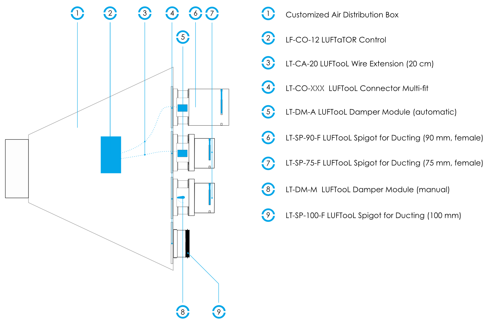 LUFTaTOR offers automatic control of individual zones for effective ventilation of homes. In cooperation with elements of the LUFTooL Distribute modular system, it is able to effectively regulate air ducts of dimensions 75, 90 and 100 mm with a flow rate of up to 100 m3/h.