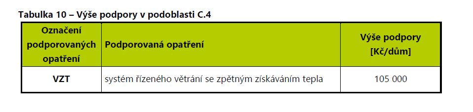 Podpora se poskytuje na pořízení a instalaci nového systému řízeného větrání se zpětným získáváním tepla včetně jejich příslušenství a zapojení.