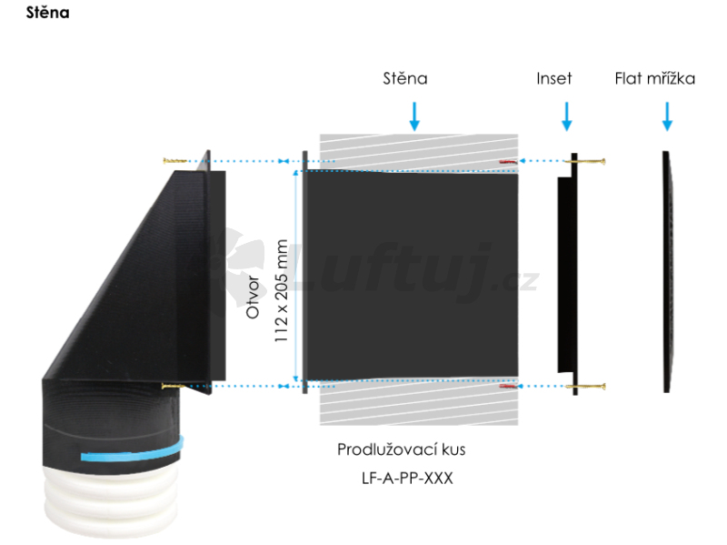 Products under the LUFTOMET®  Flat name offer a comprehensive system of compatible components – plenum boxes and grilles. The Flat system is designed to solve ventilation needs primarily in wooden buildings and the renovation of family houses and apartments. It is ideal for situations where minimal spatial requirements for the ventilation distribution are essential. Additionally, LUFTOMET®  Flat grilles provide an excellent aesthetic solution. Our Flat Plenum Boxes are: • sized for flexible plastic pipes with a diameter of 75 and 90 mm and metal ducting SPIRO 100 mm • manufactured in 15 basic variants, where it is possible to choose whether the spigot contains a control damper or not • sized to be easily installed in plasterboard, drywall, partitions or bulkhead, boxes or false ceiling • thanks to the extension pieces, it can also be used in masonry constructions • equipped with sealing rings to ensure a high tightness of the connection between the plenum box and the duct • suitable for the supply and exhaust of normally polluted air (without chemical substances, etc.) • compatible with all types of LUFTOMET®  Flat Grilles • made of hygienic ABS Package includes: Box with spigot with or without a control damper. The package for the 75 and 90 mm dimensions includes a sealing and a locking ring. For the 100 mm size, the sealing ring is fitted on the spigot. Supplied without anchoring accessories. Packed in stretch film.