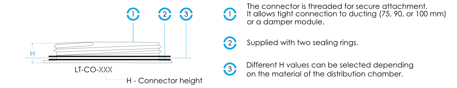 The connector is part of the LUFTooL Distribute system, which is innovative and modular. The entire system is designed for easy air regulation, thanks to which it is possible to freely distribute the air flow in individual zones or rooms in family houses and smaller businesses.