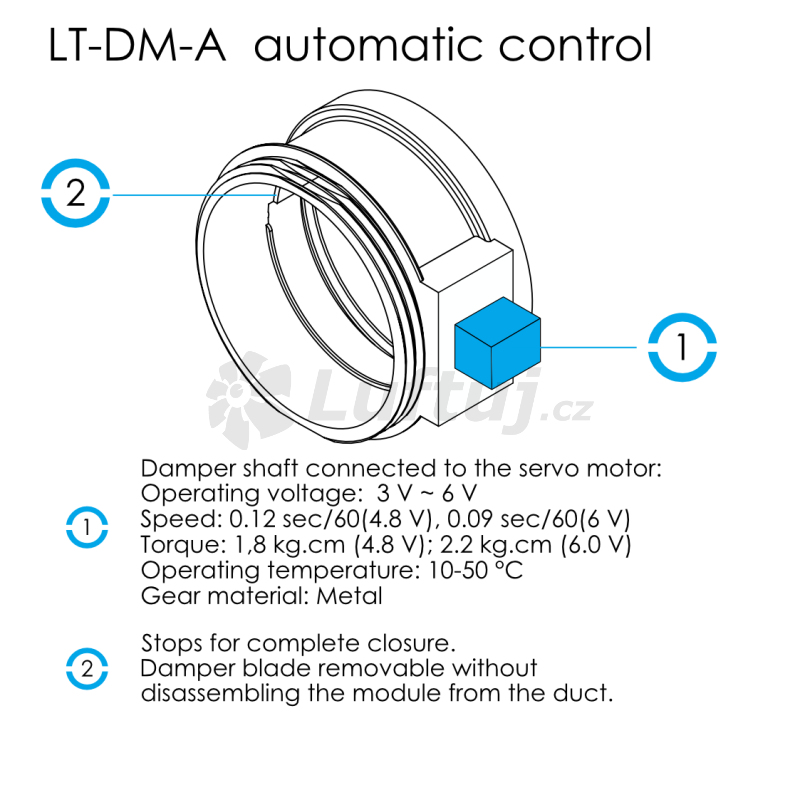 The automatic damper module is part of the LUFTooL Distribute series. The damper enables automatic control and, together with other elements of the modular system, is used for zoning ventilation with heat recovery in family houses, apartments and small businesses. The system can be used for both supply and exhaust air with flow rates up to 100 m3/h in one branch.