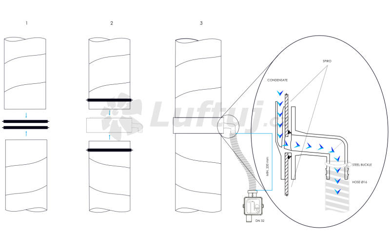 LUFTooL Trap products are designed to collect condensed water on the inside of the pipe in the ventilation systems. They are usually installed on pipes that blow air from the interior through the unheated part of the house. The condensation piece drains condensate from the duct walls outside the duct.