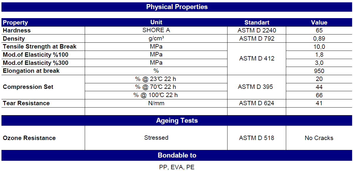 This makes the seal light and durable. It is very flexible, has excellent resistance to bending. It has a non-slip and weather resistance, is ozone resistant, retains its flexibility even at low temperatures and provides excellent resistance to many chemicals. Abrasion and crack resistance are also excellent. It is resistant to low and high temperatures. It can be easily dyed. It is recyclable, which is another advantage compared to conventional rubbers. It also has good electrical insulation properties.